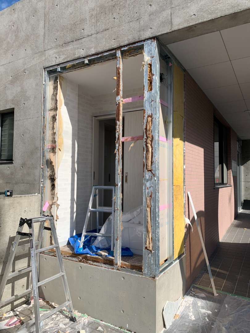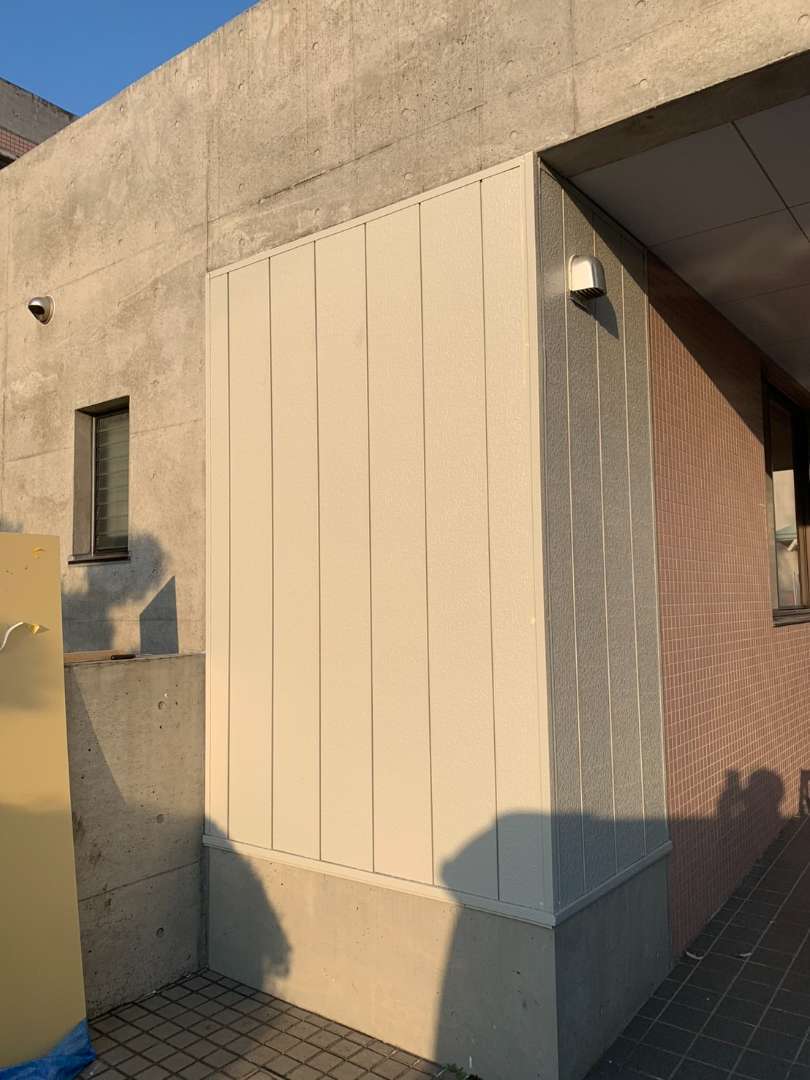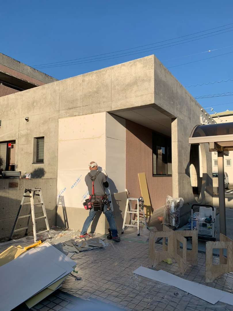 まず既存部を解体し、状態を確認したうえでLGS(軽量鉄骨)で新たな下地を構築。さらにケイカル板(ケイ酸カルシウム板)を貼り、下地の安定性と耐火性を確保しました。その後、防水シートで雨水の侵入を防ぎ、仕上げには建物の意匠と調和するサイディング材を採用。最終工程ではシーリング処理を施し、耐久性と気密性を高めています。